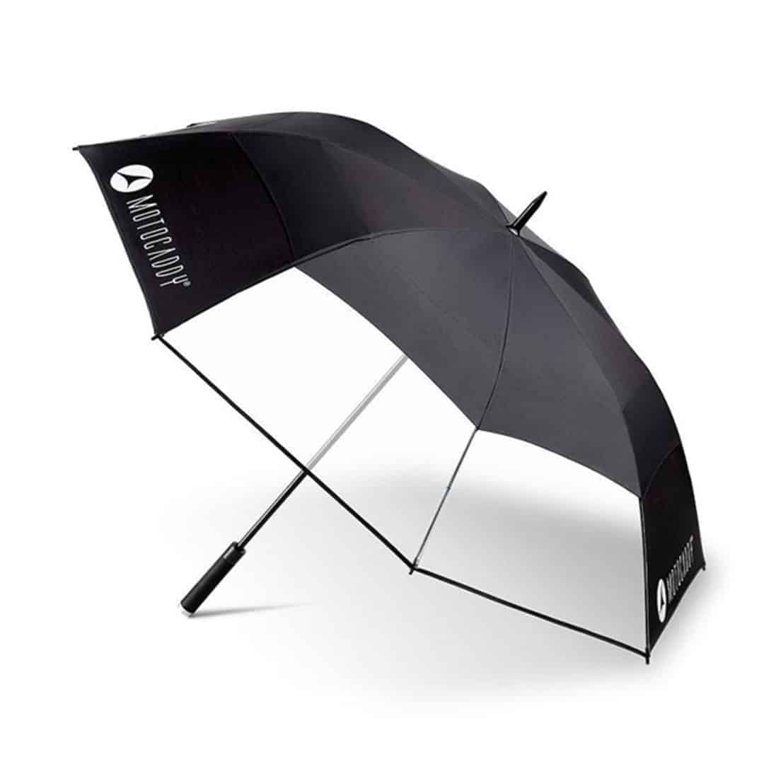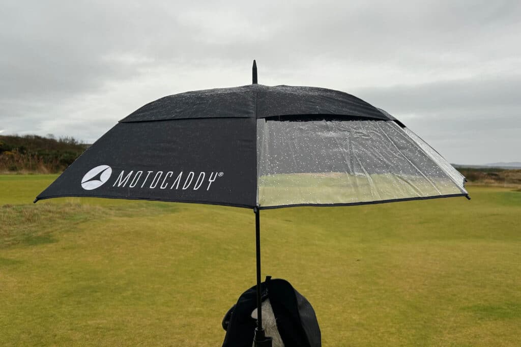 The Clearview Umbrella from Motocaddy has one very obvious design feature that is very clever. The clear PVC section covers two of the umbrella panels. Direct these panels in the direction that you are moving, allowing you to see where you are going without the umbrella obstructing your view. This is very handy especially when in an umbrella holder on a trolley.