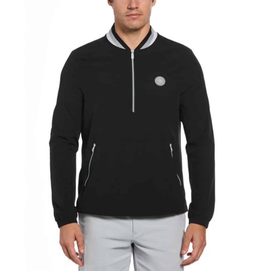 Ideal for golf or casual wear, this Original Penguin men’s golf windbreaker is designed for both style and functionality. The quarter zip closure and striped mock neck collar give it a modern edge while the perforated, stretchy and wind-resistant fabric offers breathability, comfort and protection on and off the course. This golf jacket is finished with zippered side pockets for secure storage.