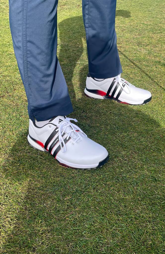 As someone that has worn several pairs of Adidas shoes throughout his golfing career (career might be a push!), I was excited to see what the Tour360 25 spikeless edition would look like. As expected, they look the real deal, especially in the Cloud White / Core Black / Lucid Red colourway.