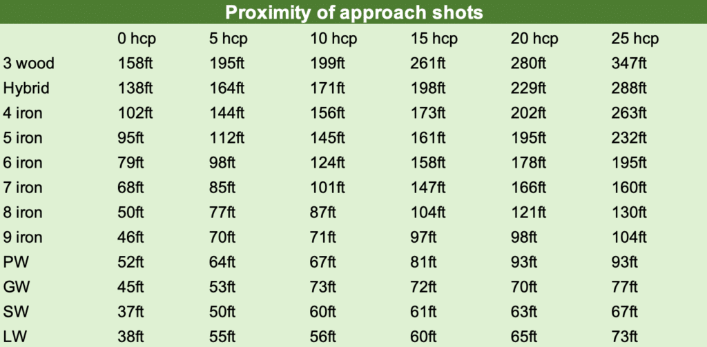 A scratch golfer has an average approach shot distance of 148 yards, for 15-handicap golfers this jumps up to 189 yards, showing you the effects of differing driving distances.