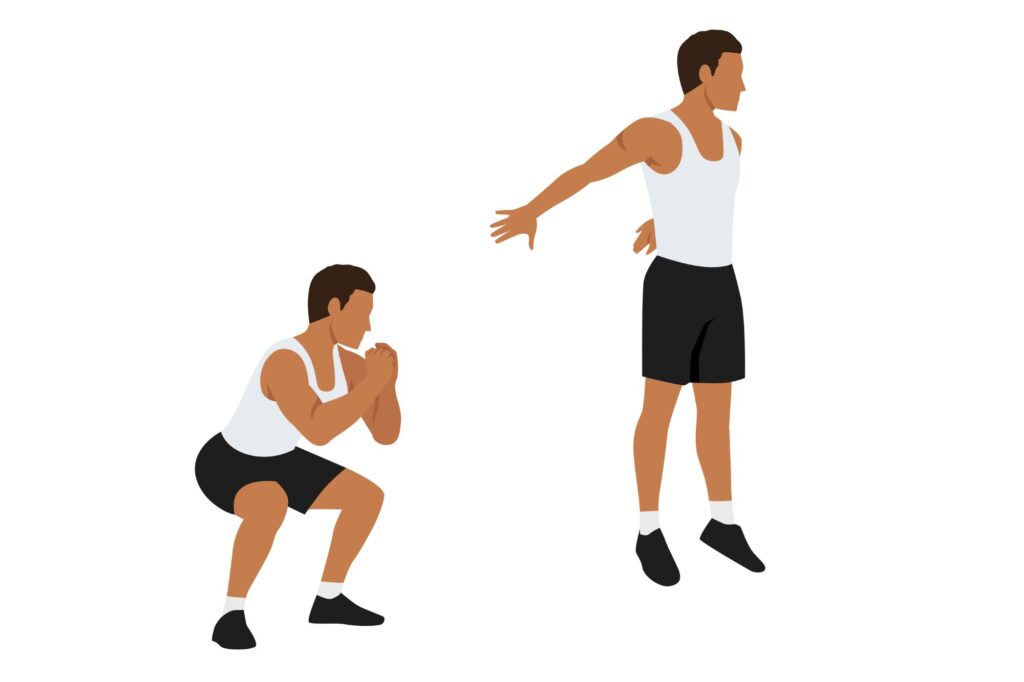 To complete, drop down into a standard squat position and then from the bottom jump up out on the squat. These can be repeated as a continious sequence, for a greater cardio benefit, or individually.