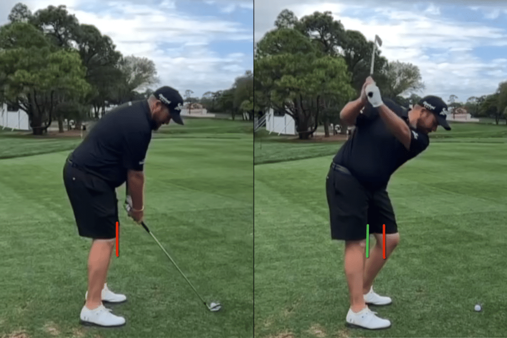 Lowry addresses the ball with a very narrow stance. This can help with range of motion and turning more in the backswing, but what is really noticeable is that as soon as he takes the club away, his left knee moves across, and his right knee moves straight back.
