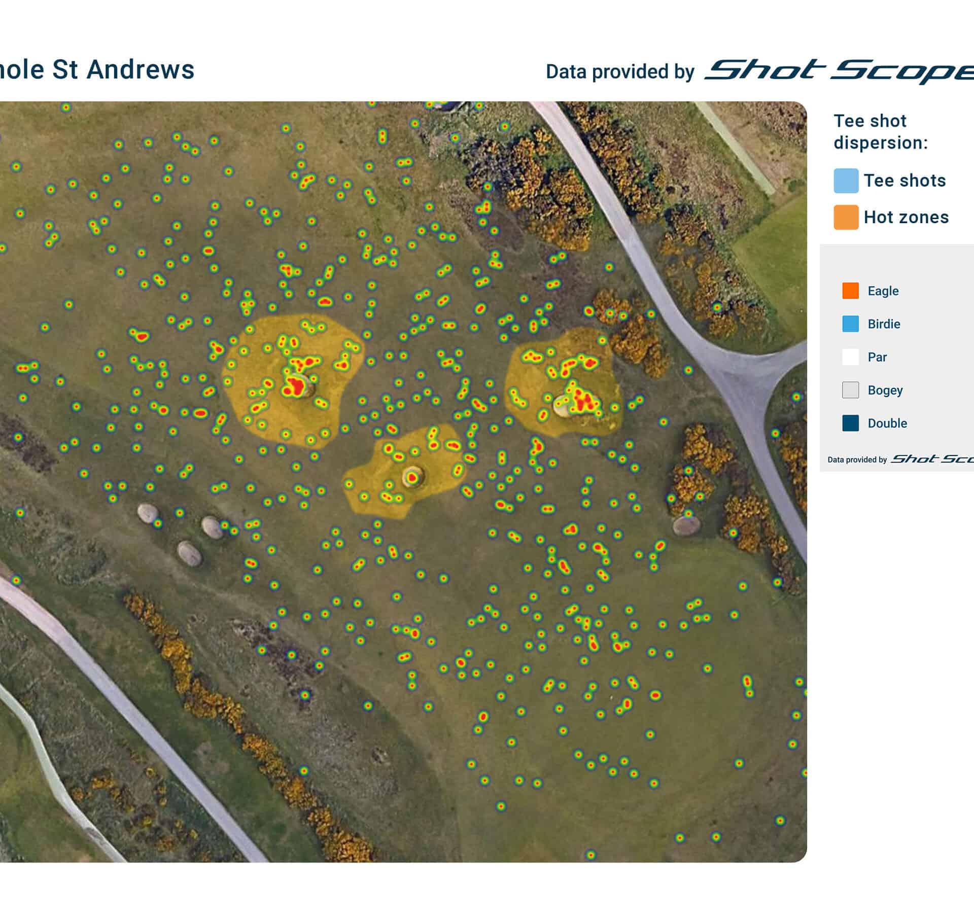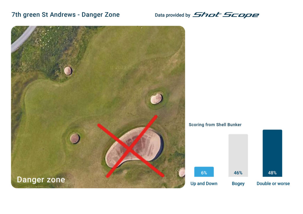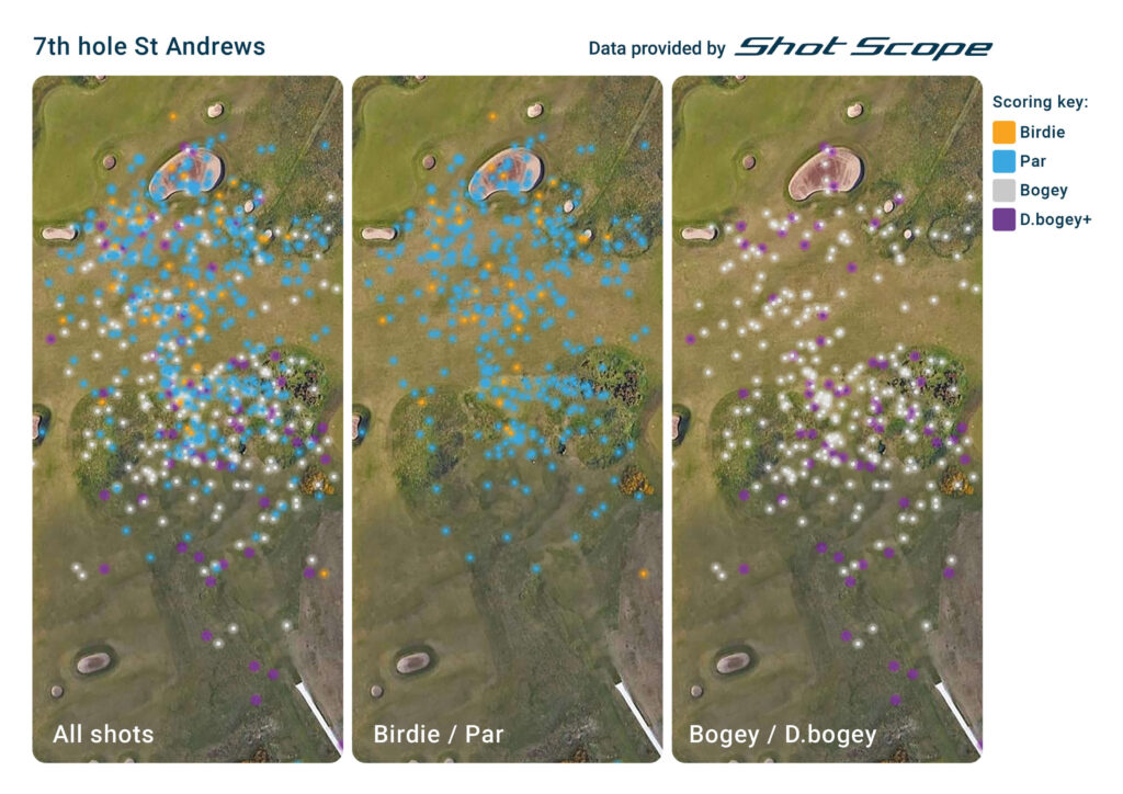 It’s surprising how many golfers make bogey or worse from the right side of the fairway, with 36% of double bogeys coming from shots finishing up on the West Sands Beach side. Perhaps having to carry the burn in three different places proves too much for the nerves?