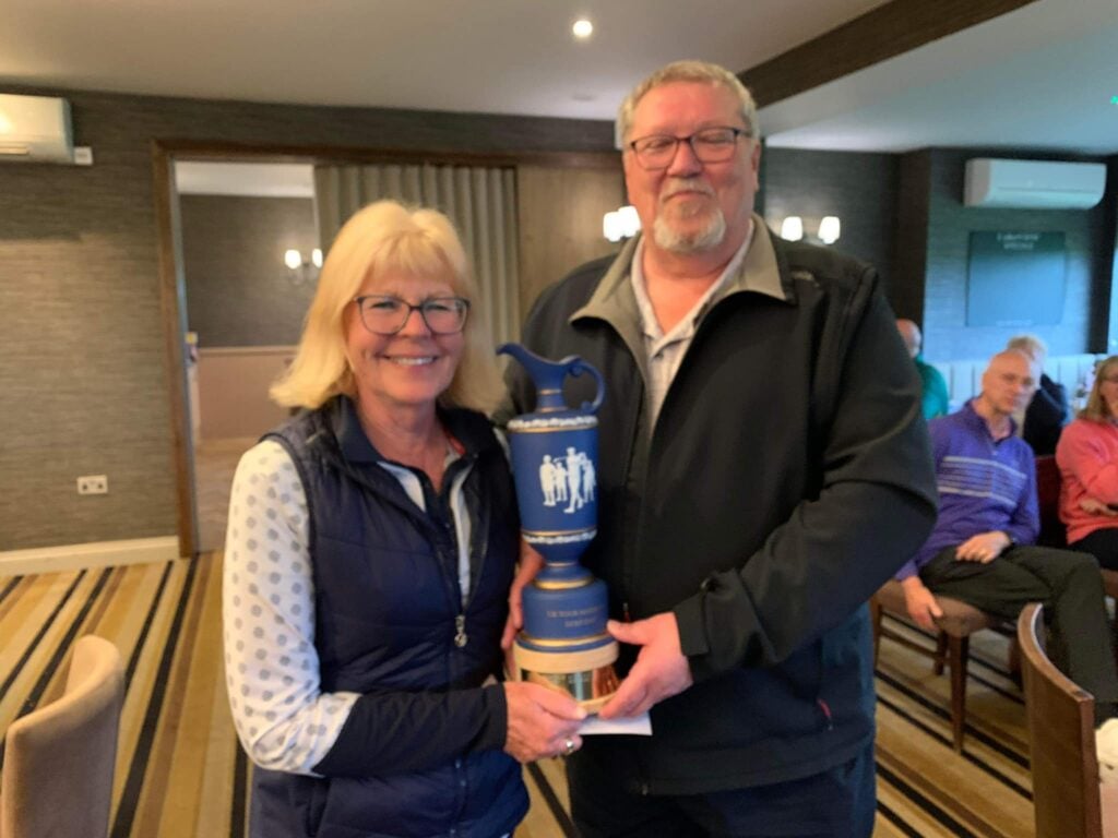 The winner Andrea Dawson and Mark Fieldston, Captain of the Nottinghamshire and organiser of the golf day.