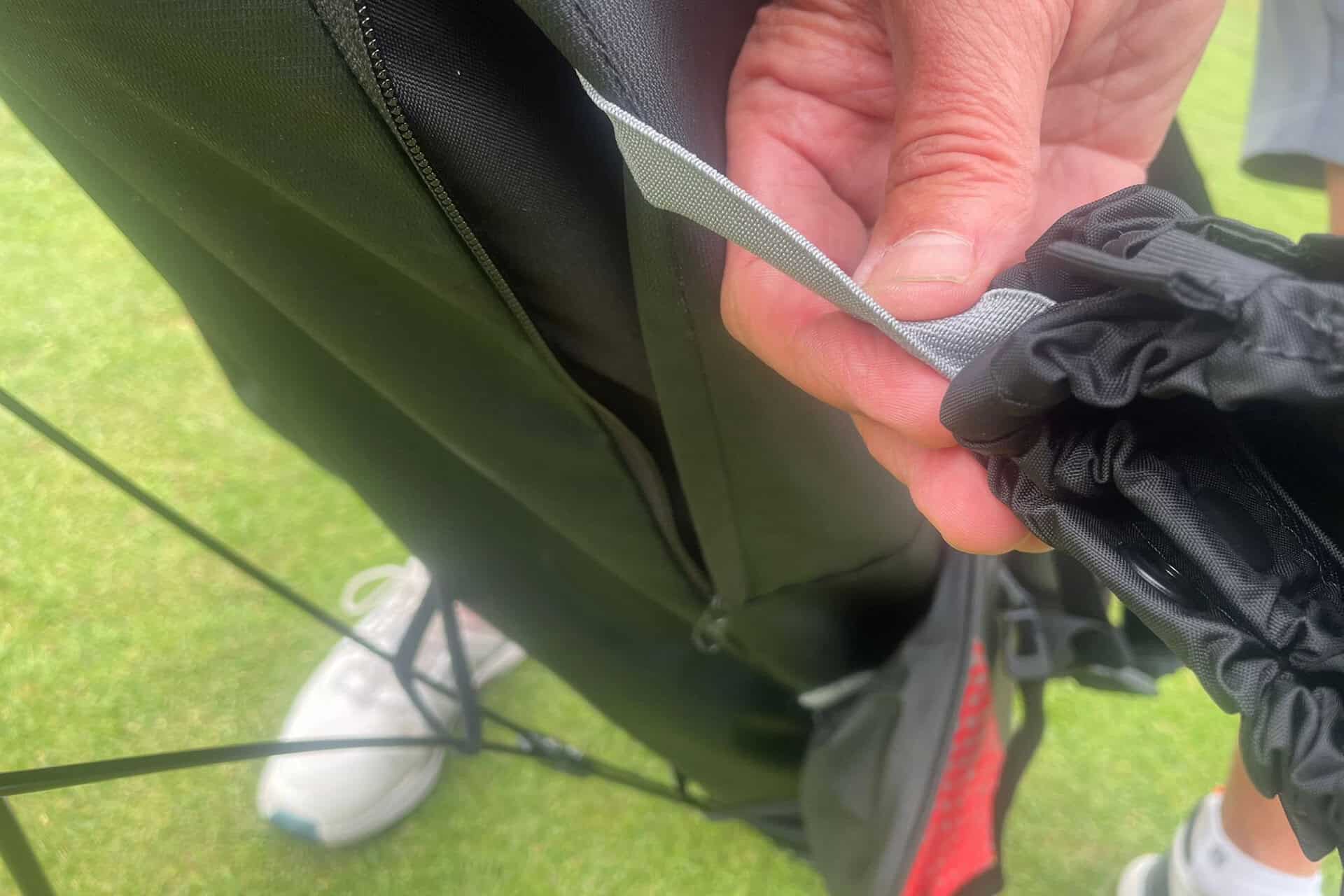We haven’t had any heavy rain in Yorkshire for ages so I haven’t been able to test it in real-world wet weather. We also have a hosepipe ban in force currently so I’ve not been able to go down that route. I have played in the odd light shower which hasn’t troubled this bag. The lightweight rain hood sits inside a separate pocket which acts as a cushioned hip pad when not deployed. This is another brilliant but simple Ping design feature. The hood is tethered to the pocket but is so easy and quick to fix in place with four press stud closures.