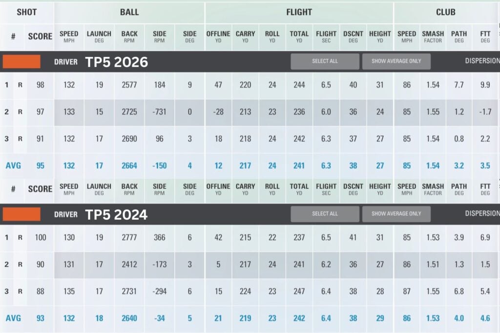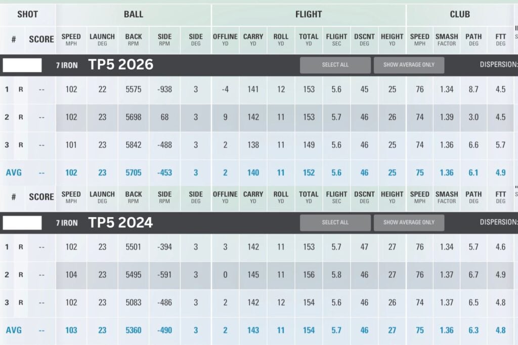 Moving onto 7 iron, the 2024 model seemed to fly marginally higher than the new ball. The 2026 TP5 averaged 5705RPM of spin which is some of the highest mid iron spin I’ve seen. I personally really like this as a player who often struggles to get the ball to stop with irons into greens, especially on firmer courses. All of the other data was very similar, wasn’t much between carry numbers and the launch angle and ball speed was the exact same.