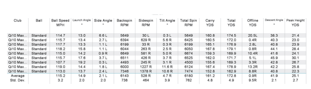 The data I collected using the Qi10 Hybrid Max is set out below. To put the numbers in context, I tend to compare myself to LPGA Tour averages – these being a carry with a 4 iron of 170 yards, ball speed of 116, launch angle of 14.3 degrees, descent angle of 43 degrees and peak height of 24 yards.