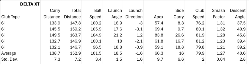 I tested the Benross Delta XT irons through the bag and collected data using the pitching wedge, eight iron, and six iron in the practice area at Scarcroft Golf Club.