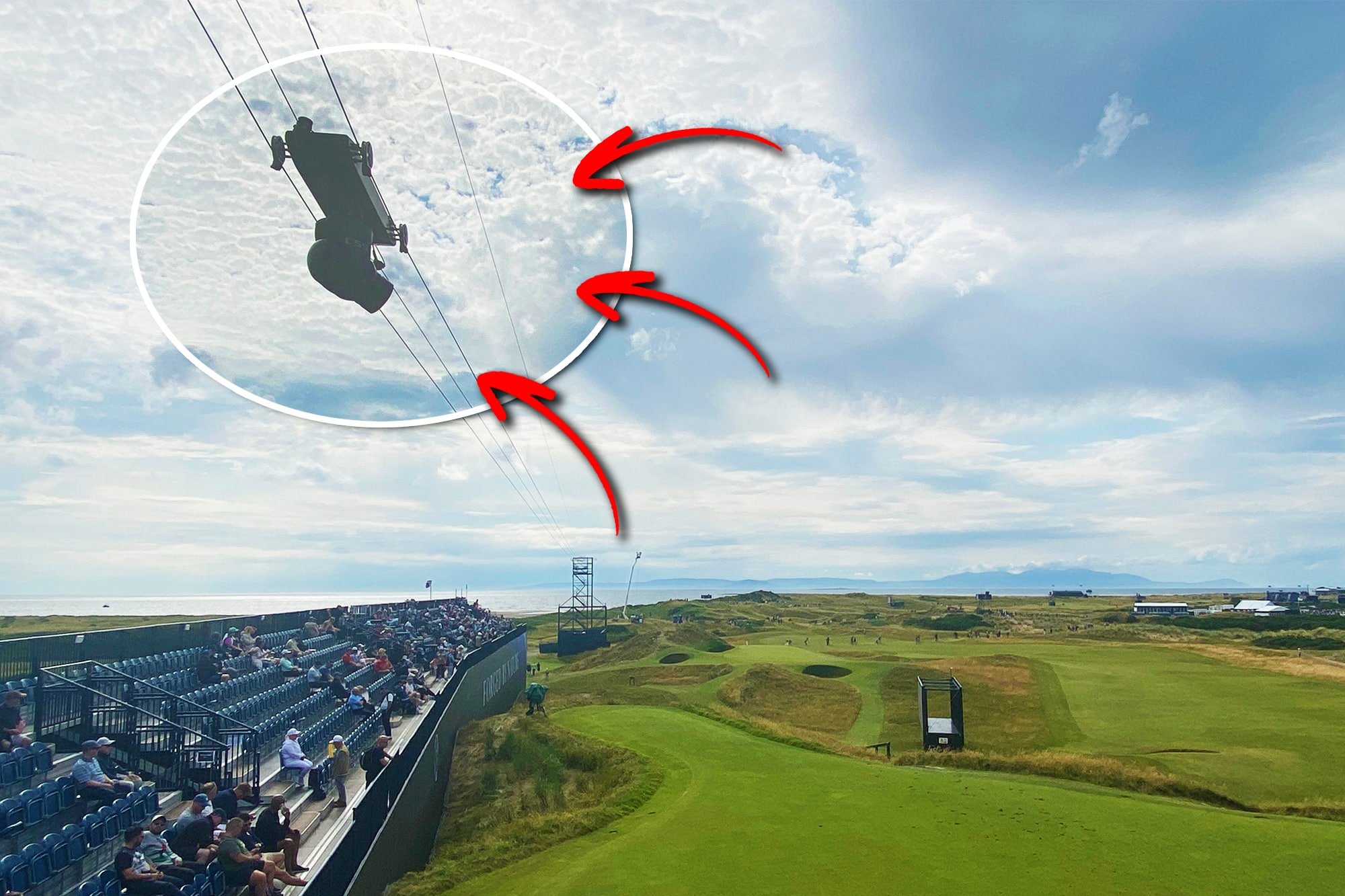 This fantastic piece of tech is strung on high from two towers close to the grandstand running right down the left hand side of the hole. It sweeps along the 123-yard par 3 on a series of support wires.