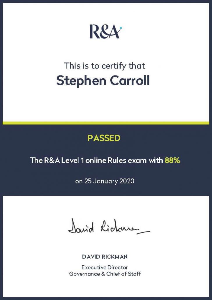 When I first took the test, back in August 2016, I have vague feelings of being asked about the spirit of the game, general etiquette, and then downloading a certificate signed by Padraig Harrington.