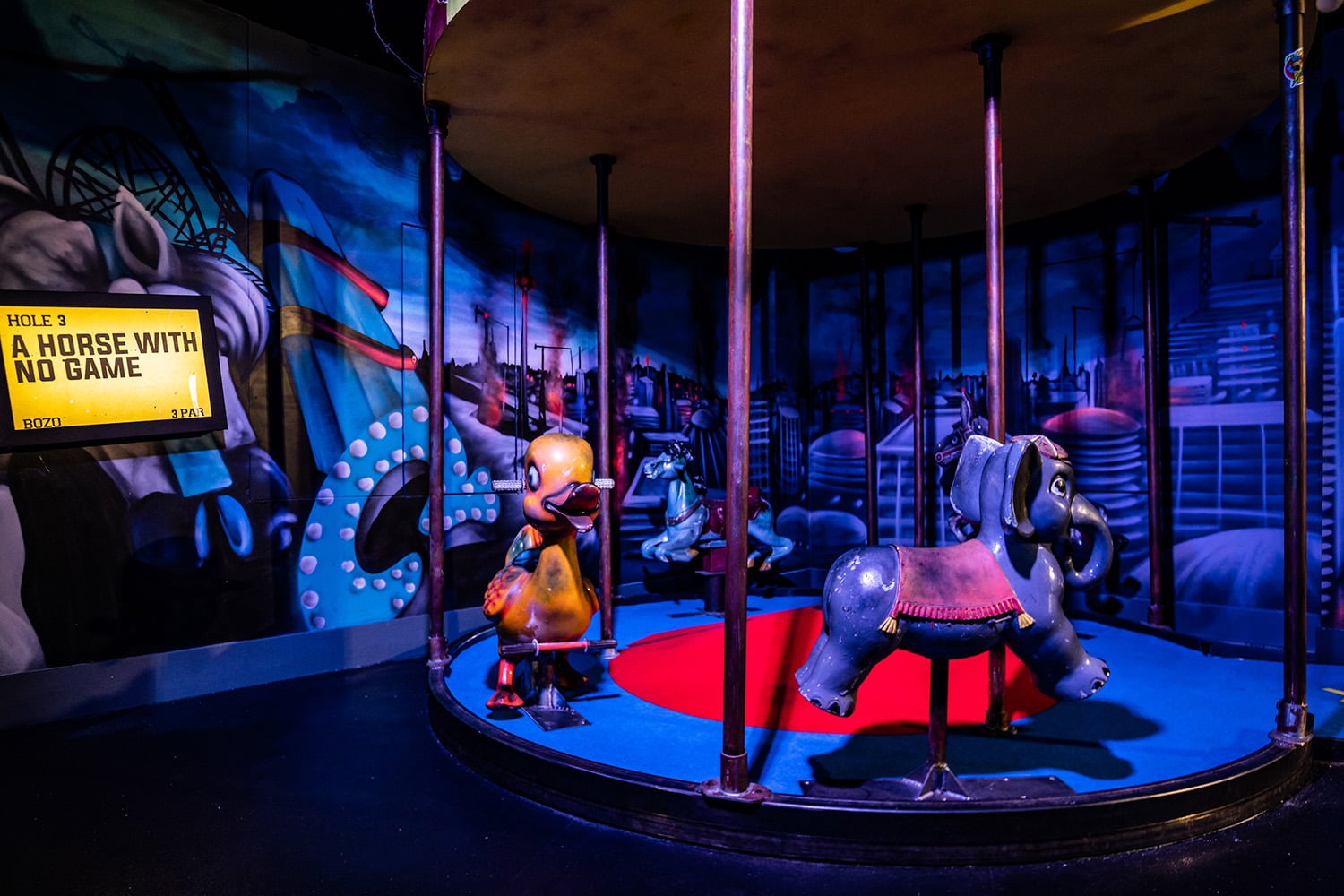 “Roll up, roll up! It’s the creepiest show on earth. Hate clowns? GOOD! Face your fears through nine holes of circus freaks and fairground creeps. Check out the Ferris Wheel, Hall of Mirrors and avoid some pretty shit-scary clowns. Time to run away from the circus…”