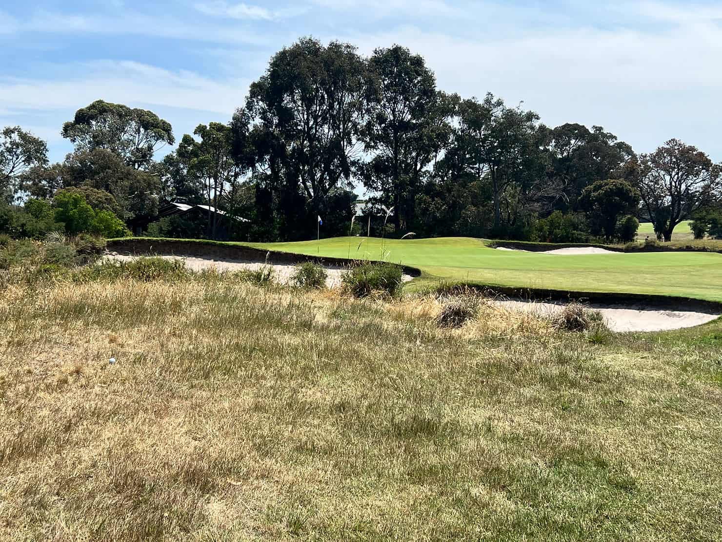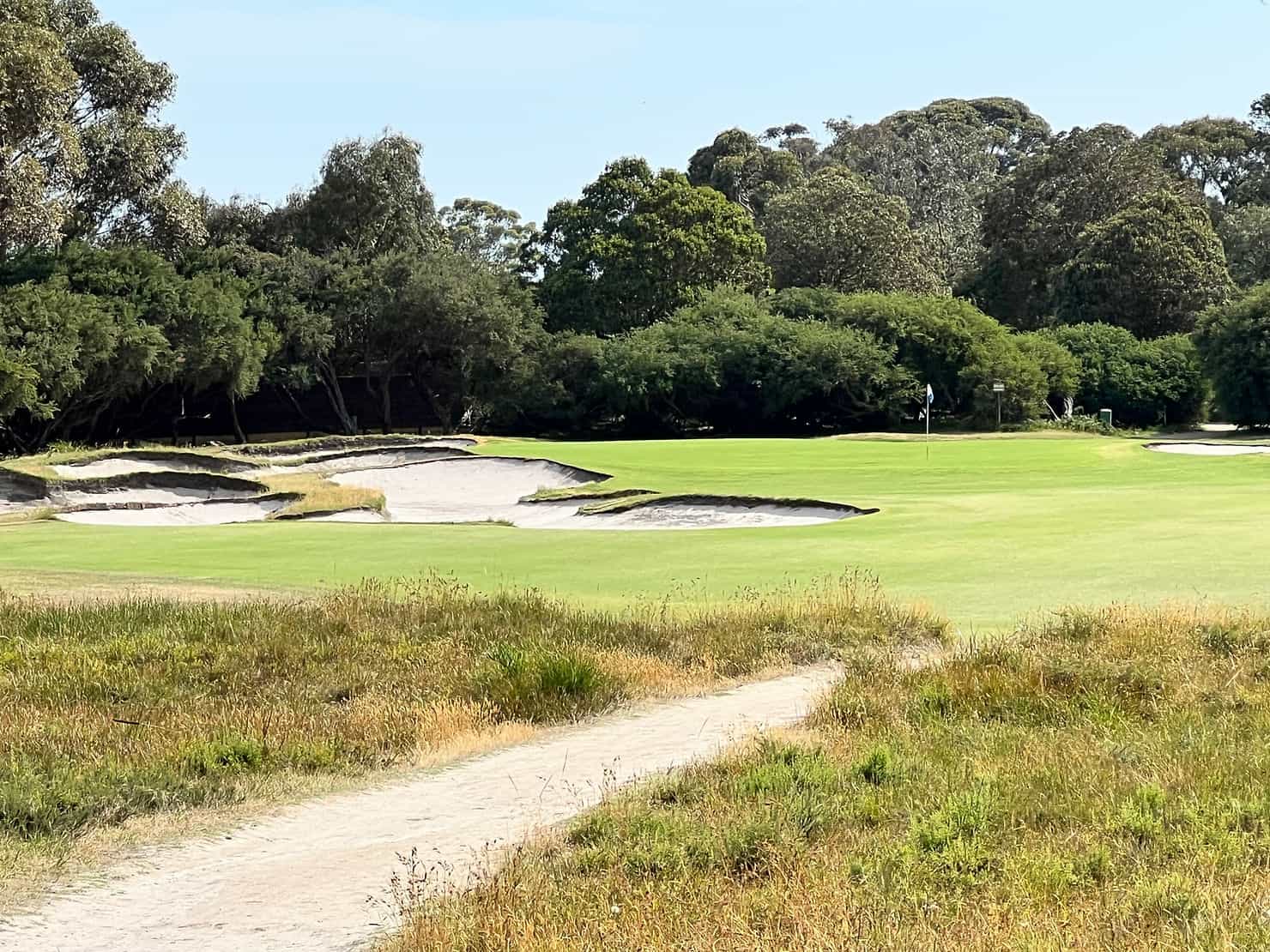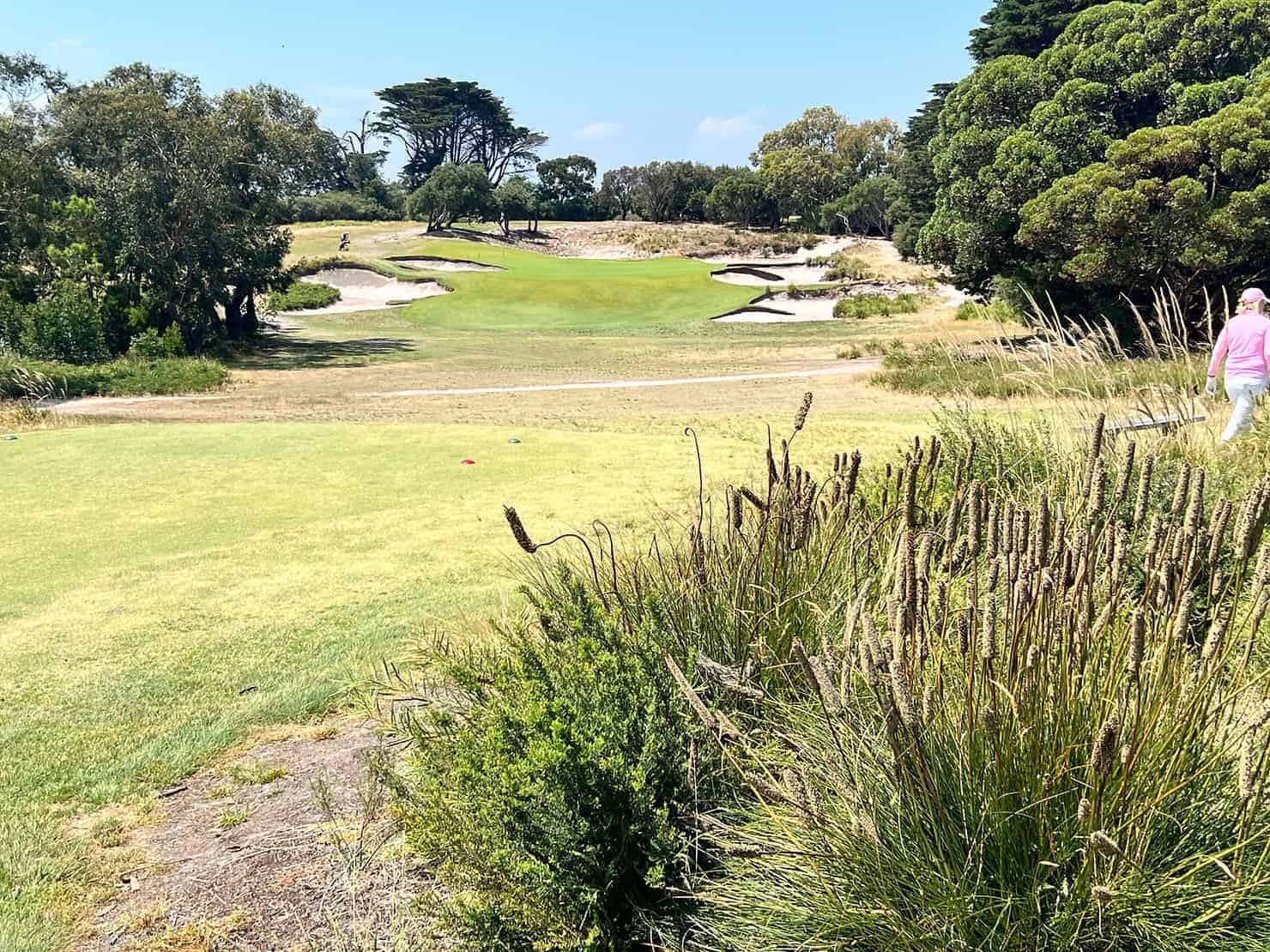 Across the road is the 13th, a stunning par 3 with bunkers guarding the green’s front, left, and right. To avoid them, Mrs. W struck long and, from nasty rough, she pitched to about 30 feet and rolled in her par. Compared to her glory on the East, she had not fared so well on the West, so we decided to compete on the remaining five holes for our imaginary Royal Melbourne Cup – totalling our Stableford points over the two rounds.