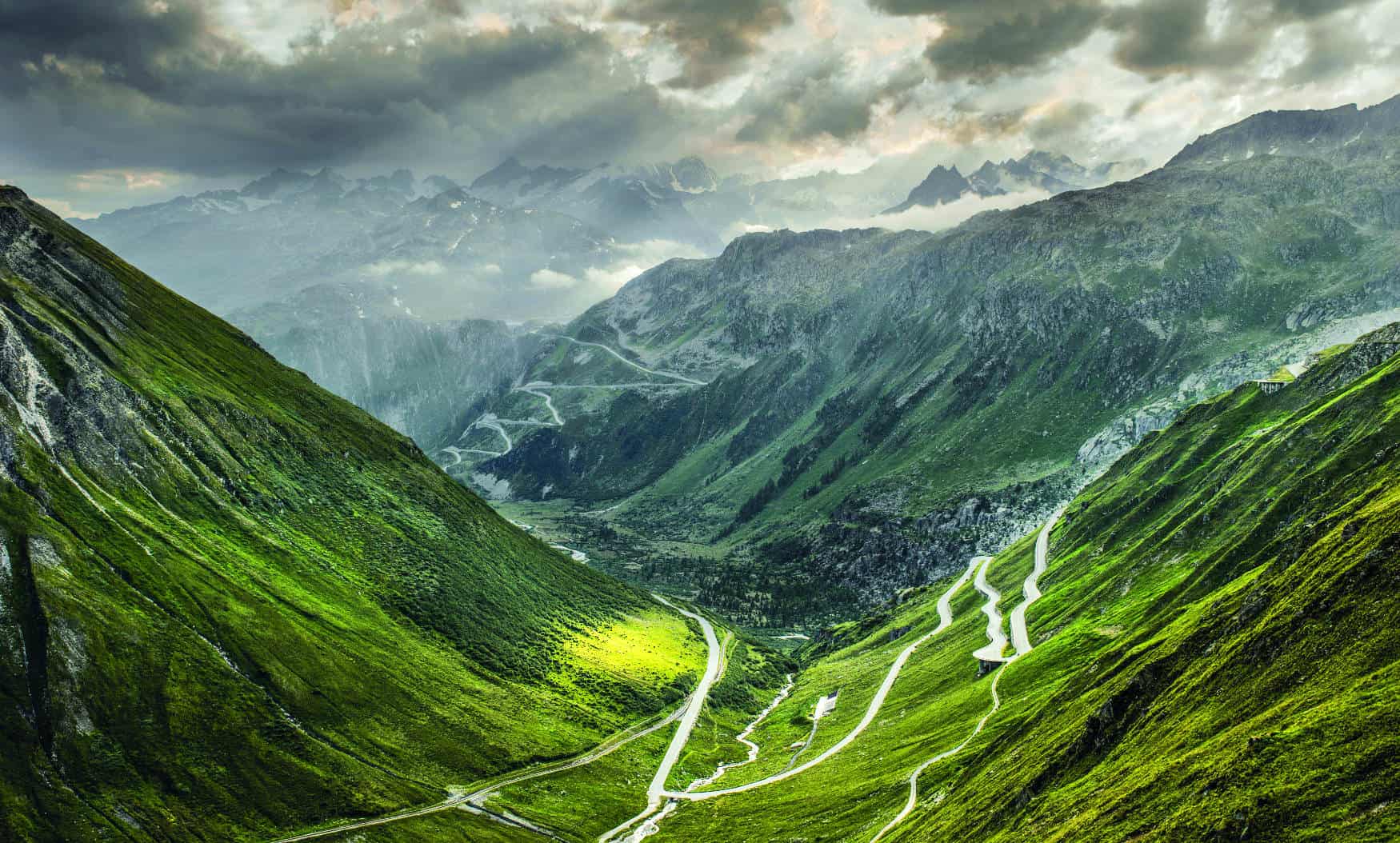 A series of dramatic hairpin bends winds up to 2,400 metres, past the spectacular Rhone Glacier, before descending via equally epic but terrifying sweepers, with the dizzying sensation of both mountains and weather closing in. The sense of euphoria as the road levels out owes as much to a sense of relief as it does the thrilling views.