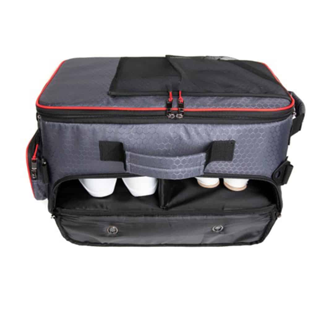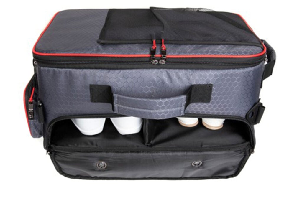 Made from rugged 300D polyester, it features a PU-coated bottom for added durability, a mesh cut-out for ventilation, and zippered side pockets for extra storage.